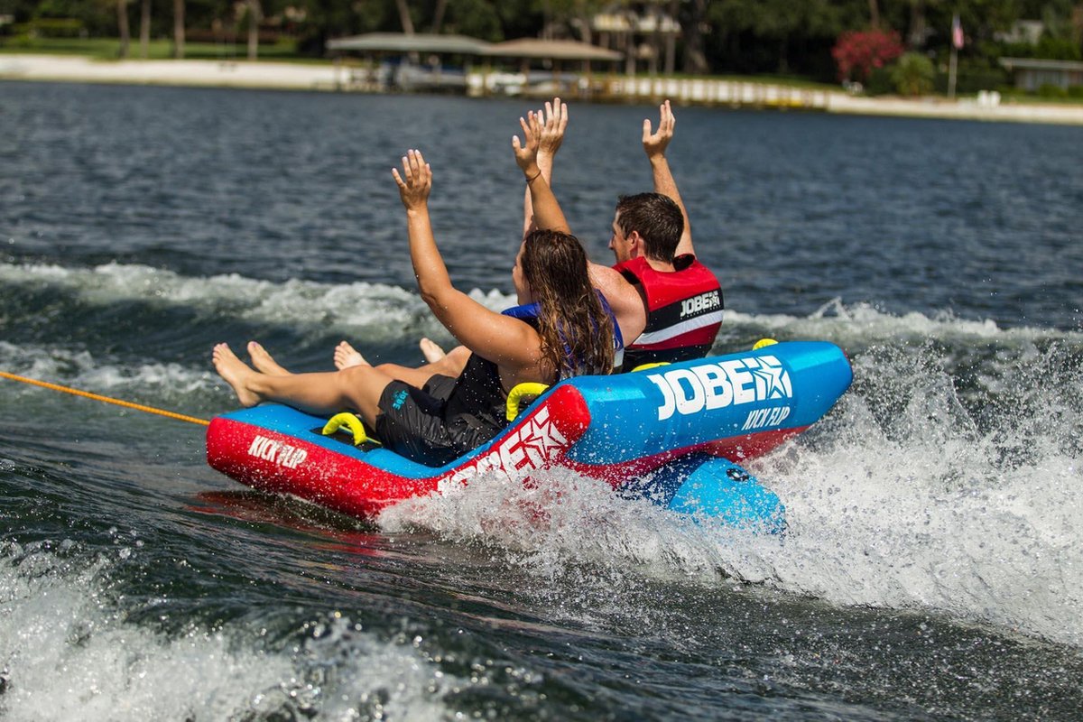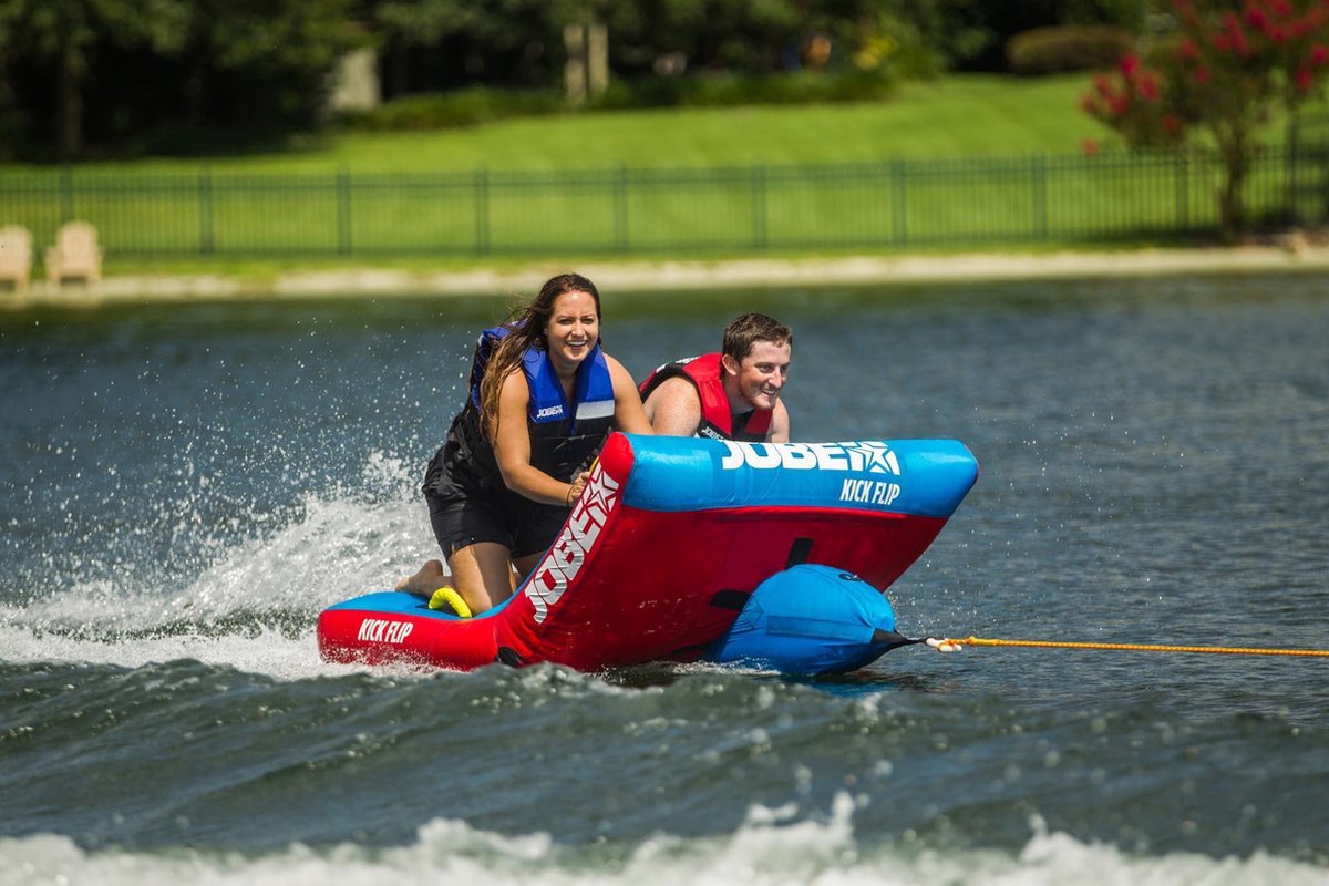 The shape of the Kick Flip provides a wild ride for you and your friends or family, yet you can easily switch to an easy ride. With the dual tow points of the Kick Flip you can attach your rope to the front quick connector with 1 or 2 riders sitting down, or connect to the rear to ride in a sporty kneeling position. When the action is over, you can use the Kick Flip as the ultimate lounge sofa to chill.